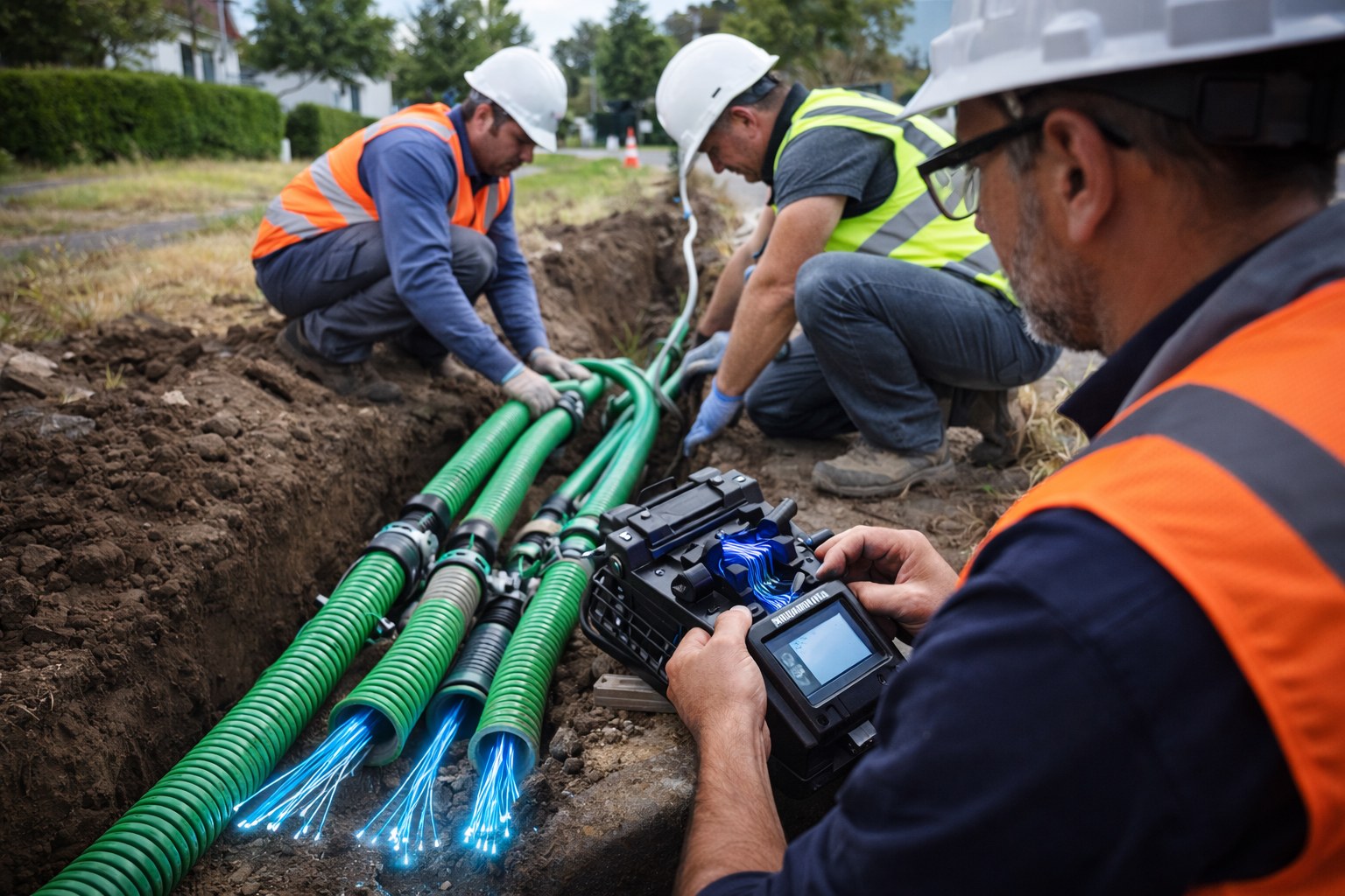 Saha uygulama sürecinde HDPE boru döşeme, mikro kanal sistem kurulumu, menhol ve ek odası imalatı, kanal açımı ve zemin kaplama işlemleri uzman ekipler tarafından gerçekleştirilir. Gerektiğinde yatay yönlendirilmiş sondaj (HDD) teknolojisi kullanılarak trafik akışı ve çevresel etkiler minimum seviyeye indirilir. Kentsel kazı çalışmaları yürürlükteki mevzuatlara uygun şekilde yürütülür ve saha rehabilitasyonu eksiksiz tamamlanır. Fiber kablo çekimi sırasında minimum bükülme yarıçapı, çekme kuvveti limitleri ve kablo koruma standartları dikkate alınarak hat performansı ve uzun vadeli dayanıklılık güvence altına alınır.